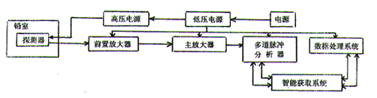 能谱数据获取与处理系统:由ADC智能获取接口和计算机组成。探测器到ADC进行模—数转换,智能获取接口对ADC的每个复换码进行实时处理、显示、数据压缩,并每隔一定时间将已压缩的数据由接口传送至计算机,已进行谱显示的更新,每个谱的长度、宽度、停机方式和条件,起、停都由计算机独立控制。在测量过程中,计算机可以停机或处理其它数据。